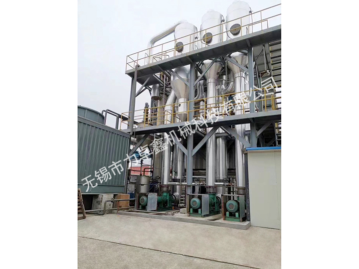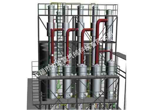 工作原理:四效降膜蒸發(fā)器需濃縮的料液由泵送入加熱管頂部,沿著加熱管內(nèi)壁形成液膜向下流動(dòng)。在這個(gè)過程中,由于管外的加熱,管內(nèi)液膜開始沸騰并部分蒸發(fā)